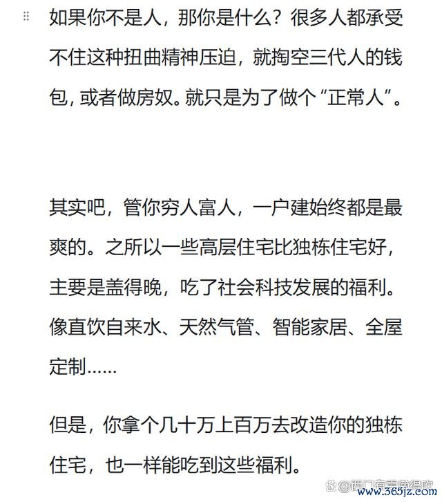 四合院贵只不外是有价无市结果,那种屋子你去住住试试就知说念舒不陶然了。至于日本的一户建陶然不陶然,螺丝壳里作念说念场,我归正没以为有多陶然。竟然陶然的是大别墅,并且住起来亦然需要有保姆有工东说念主的,小门小户就别思了。